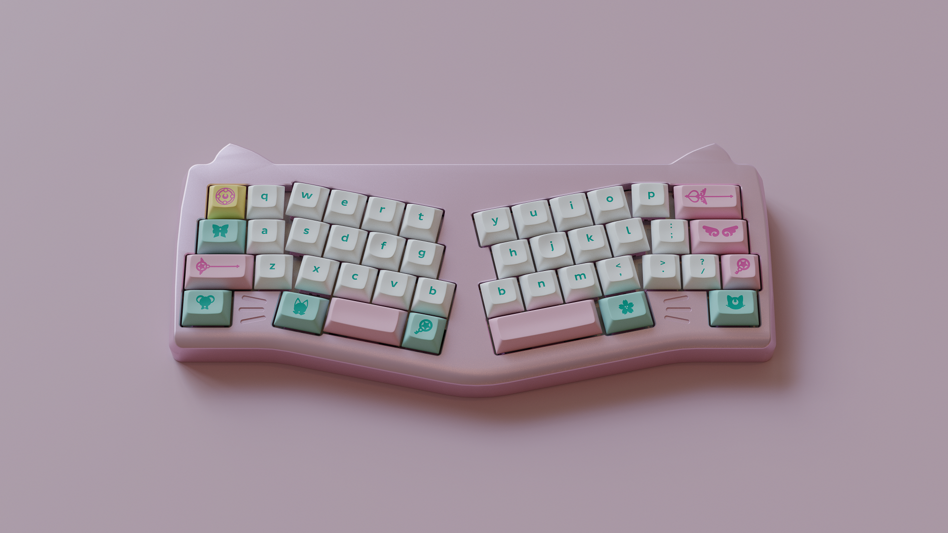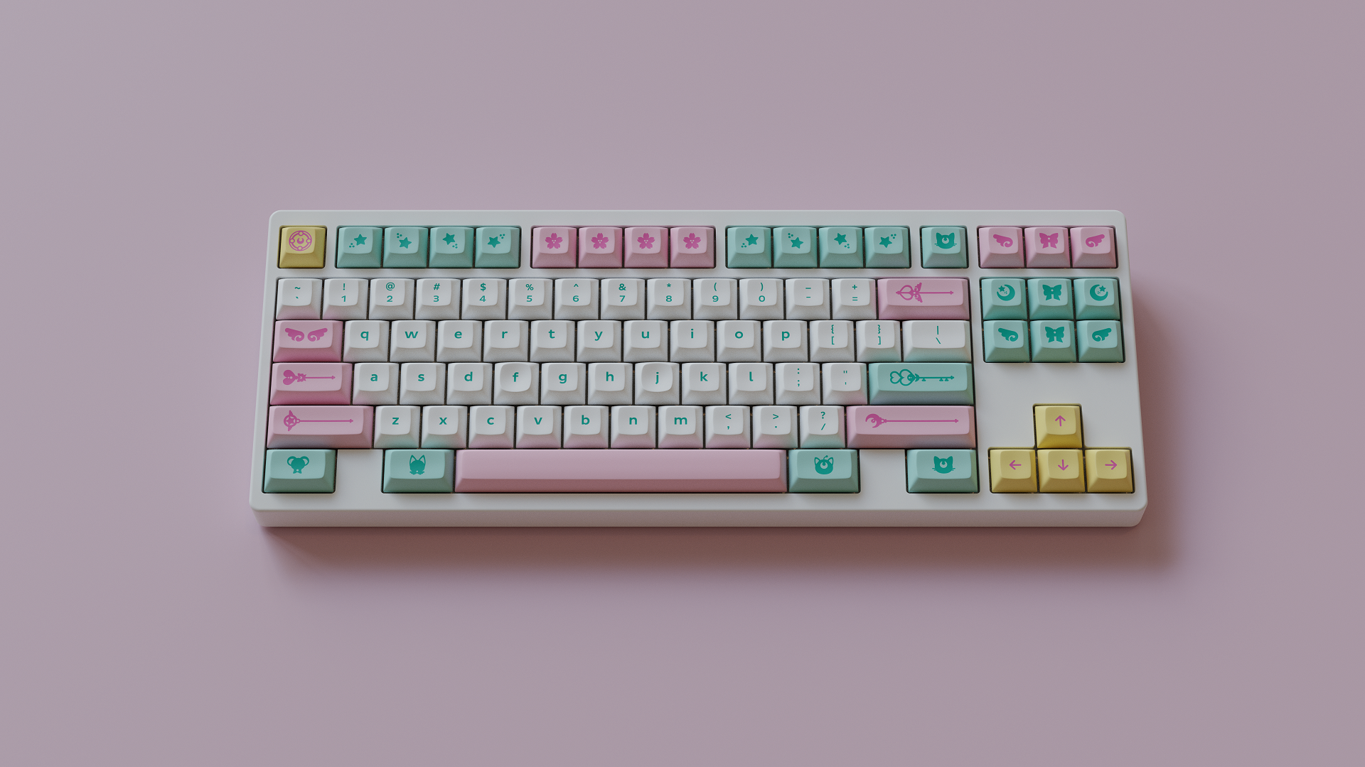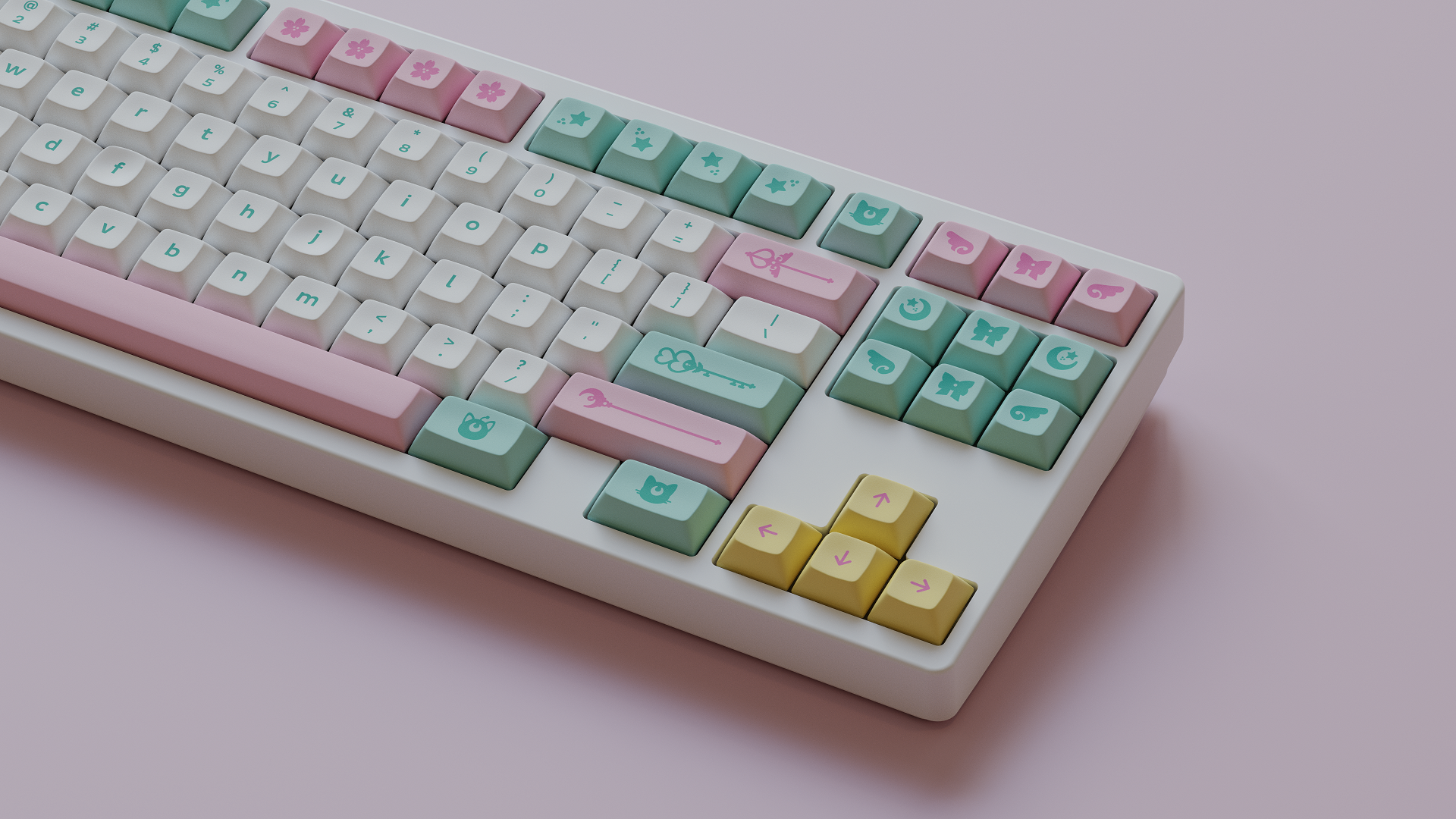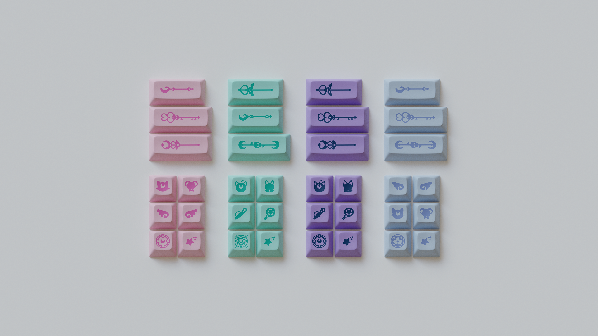 Magic Girl is a keycap set designed as a love letter to the iconic shoujo manga and anime of the 90s by Mintlodica. I created several 3D Visualizations for the set inspired by the soft, pastel colors of the set and of the era which it comes from. In order to display each variant of the set in one shot, I created a scene which accents the soft nature of the iconography and highlights the color identity seen in the set.
