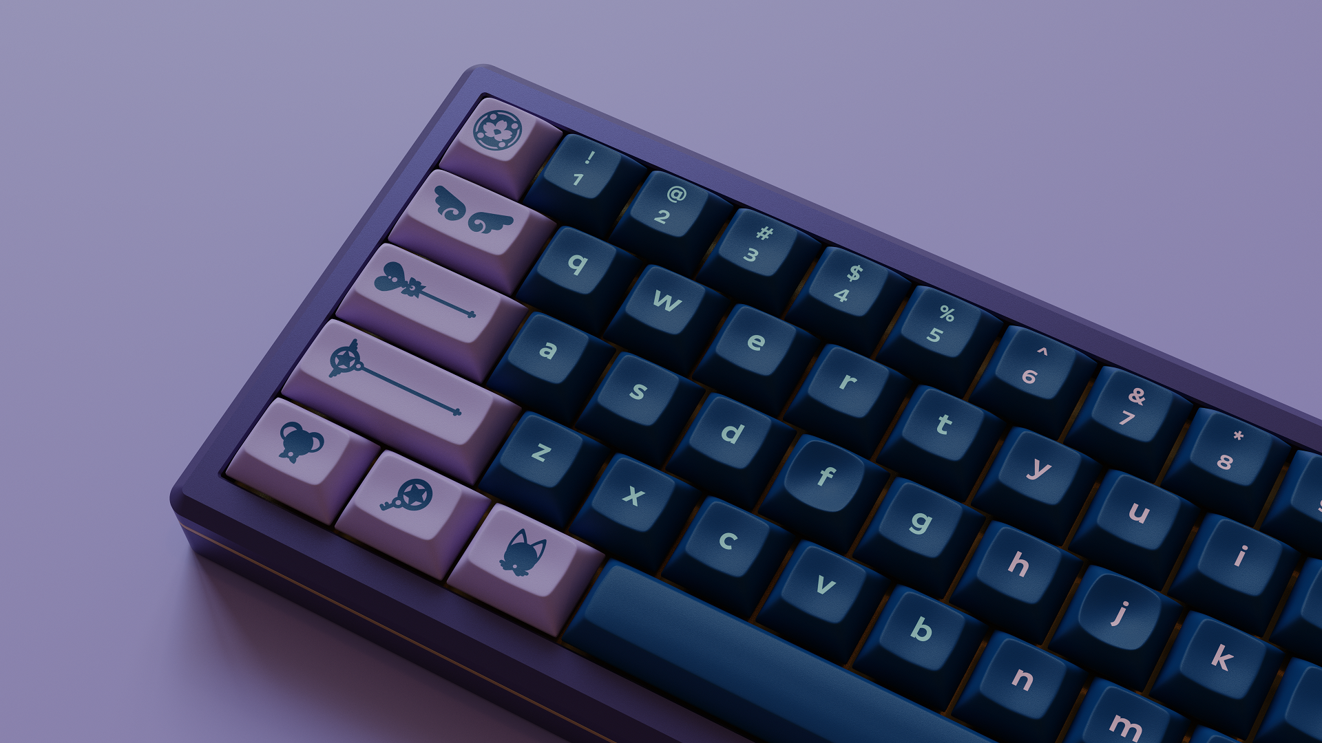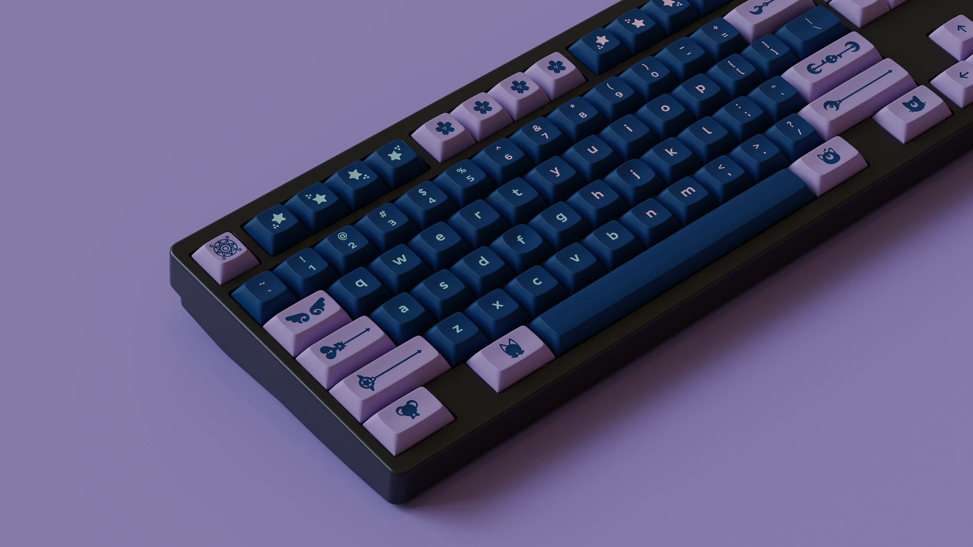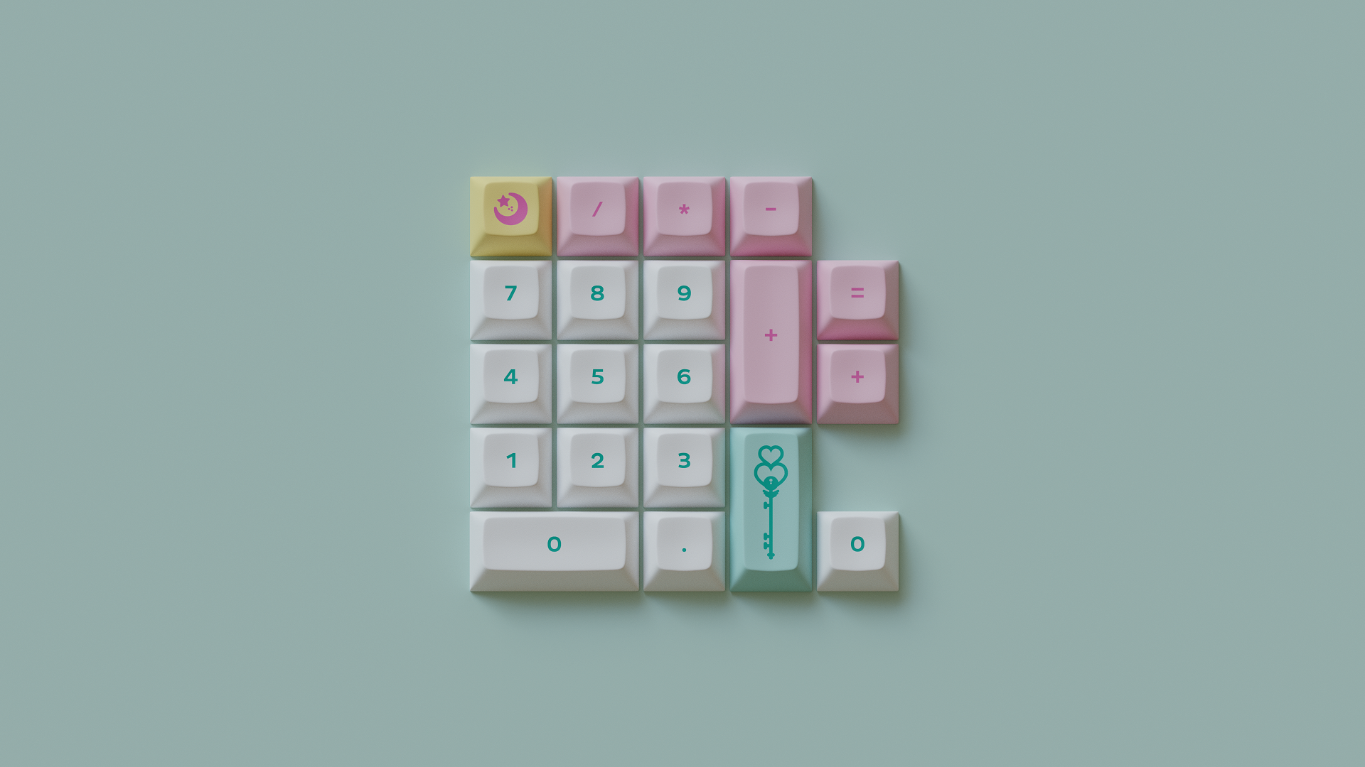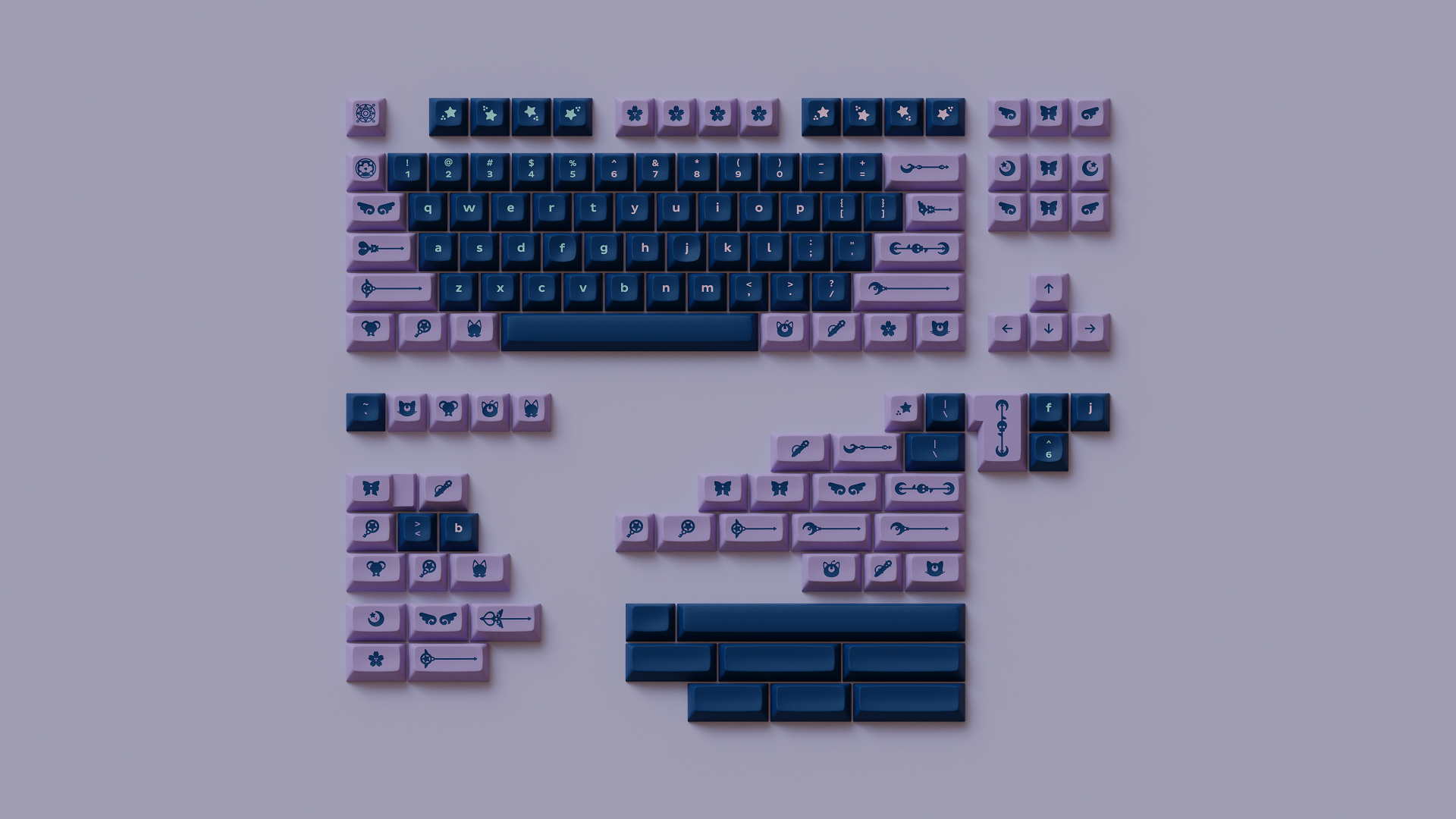 Magic Girl is a keycap set designed as a love letter to the iconic shoujo manga and anime of the 90s by Mintlodica. I created several 3D Visualizations for the set inspired by the soft, pastel colors of the set and of the era which it comes from. In order to display each variant of the set in one shot, I created a scene which accents the soft nature of the iconography and highlights the color identity seen in the set.