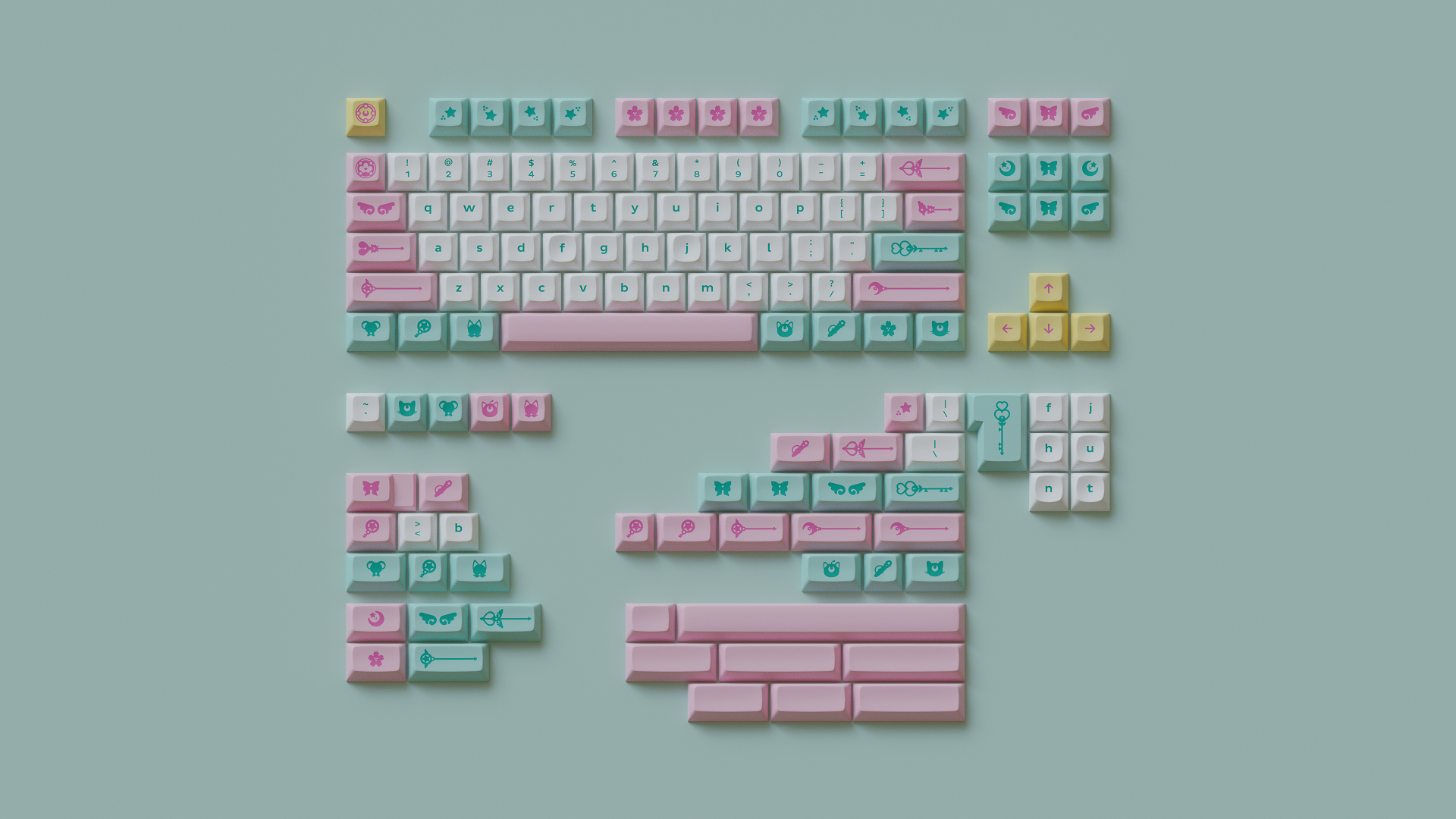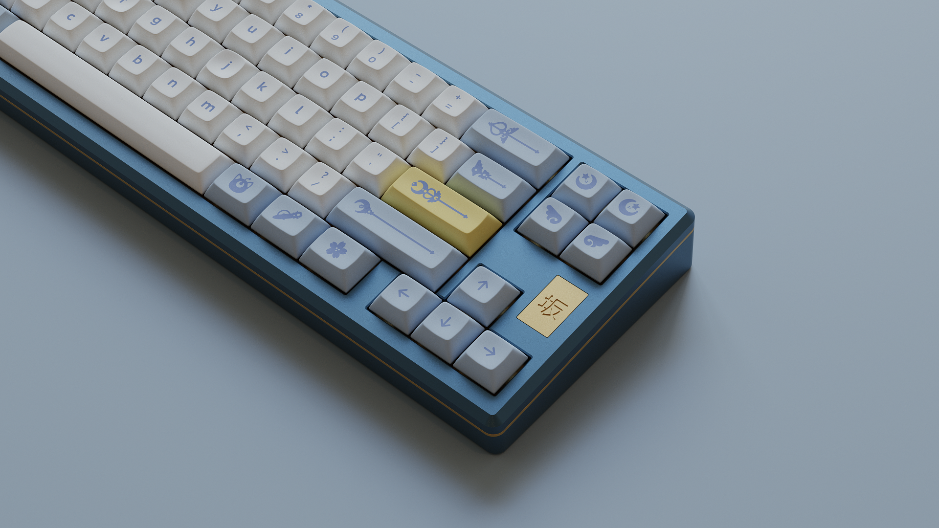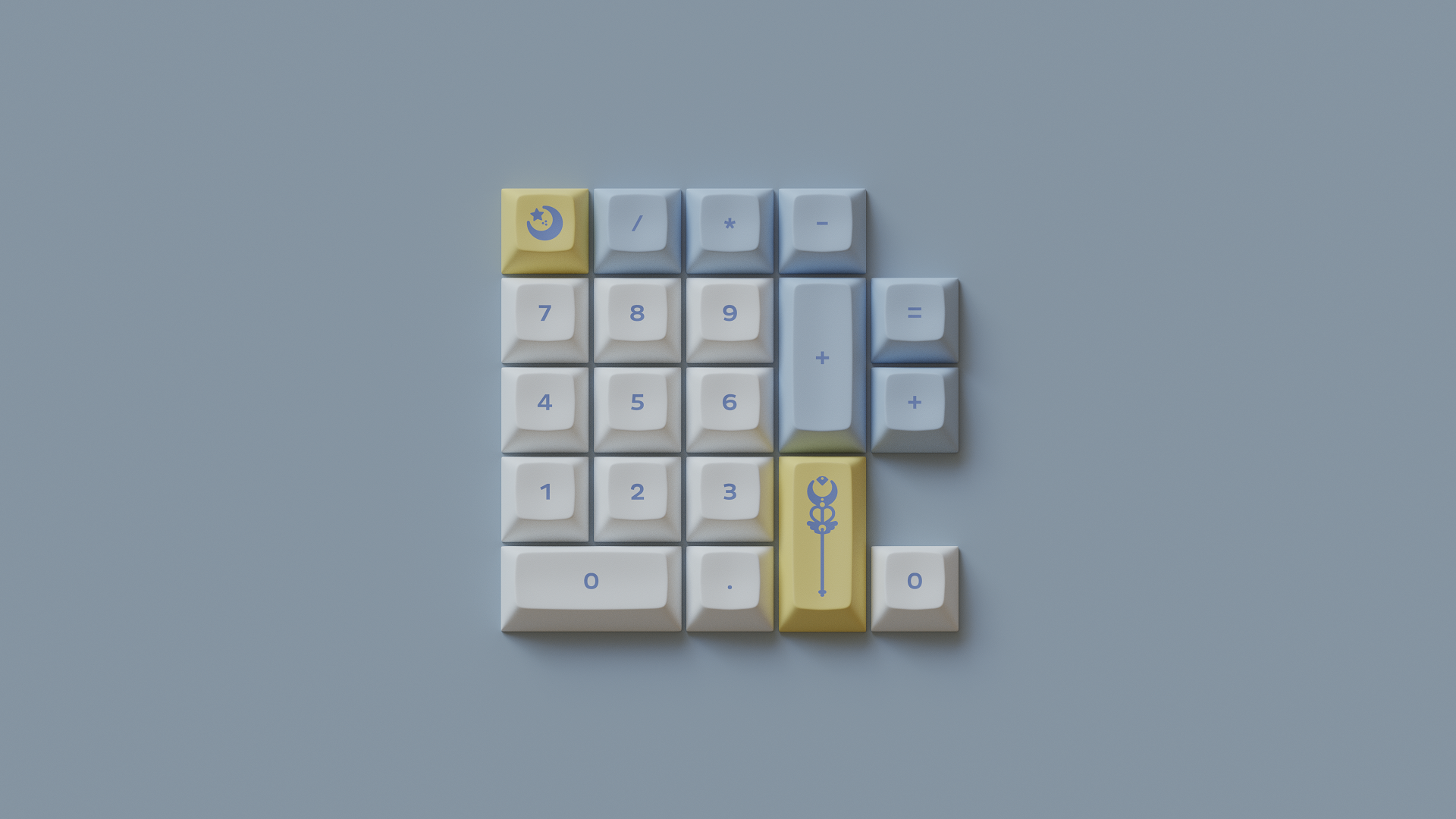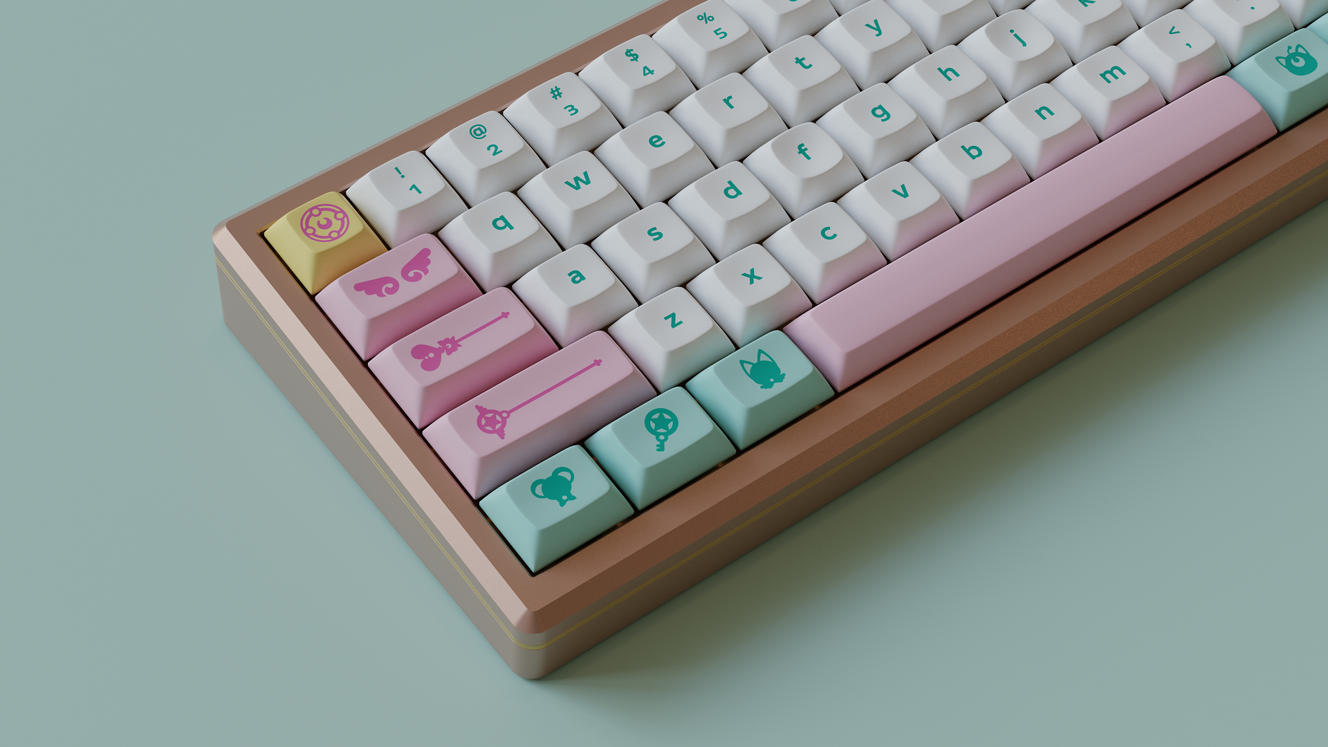 Magic Girl is a keycap set designed as a love letter to the iconic shoujo manga and anime of the 90s by Mintlodica. I created several 3D Visualizations for the set inspired by the soft, pastel colors of the set and of the era which it comes from. In order to display each variant of the set in one shot, I created a scene which accents the soft nature of the iconography and highlights the color identity seen in the set.