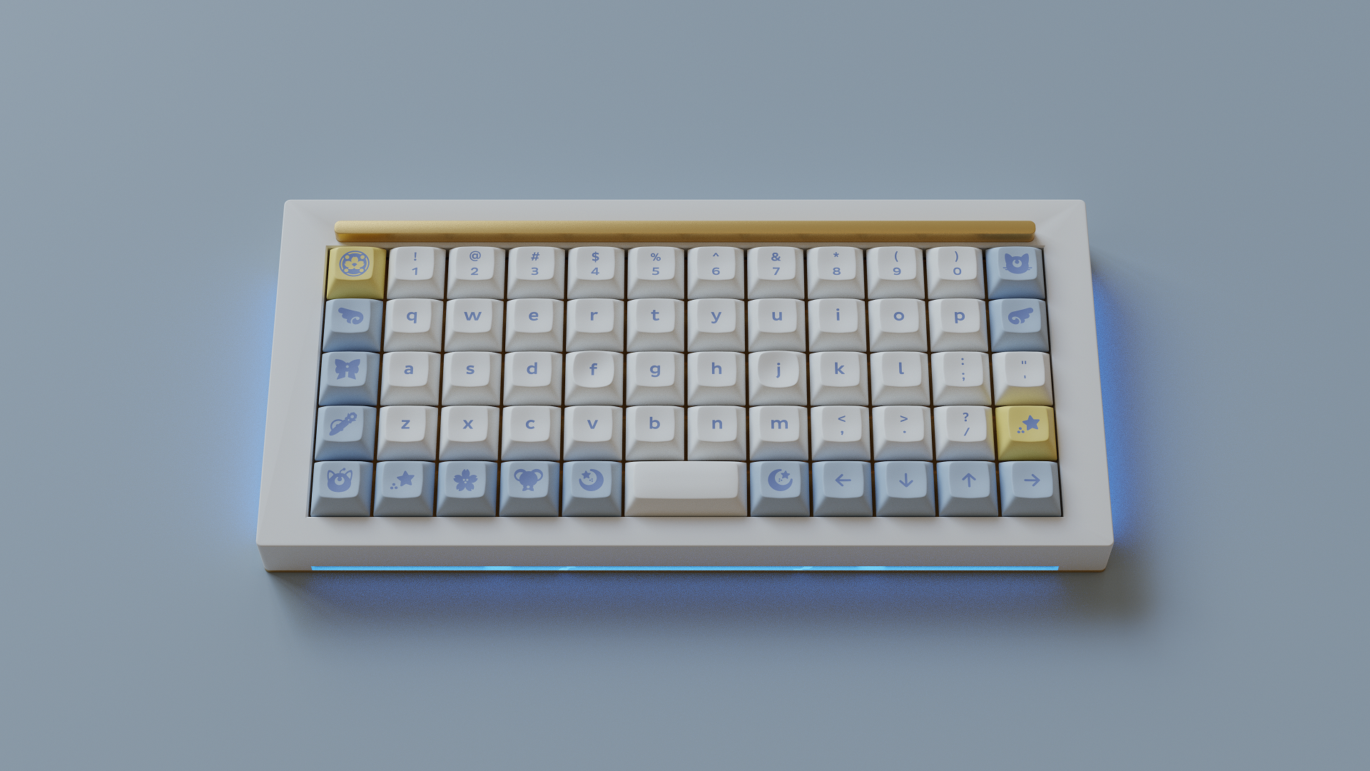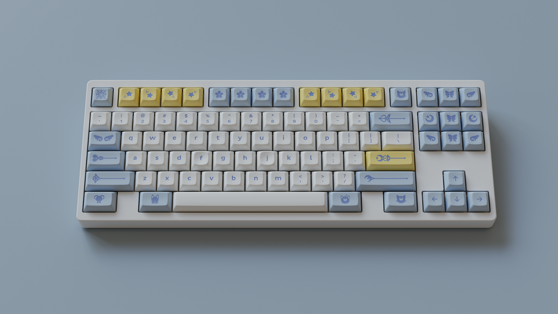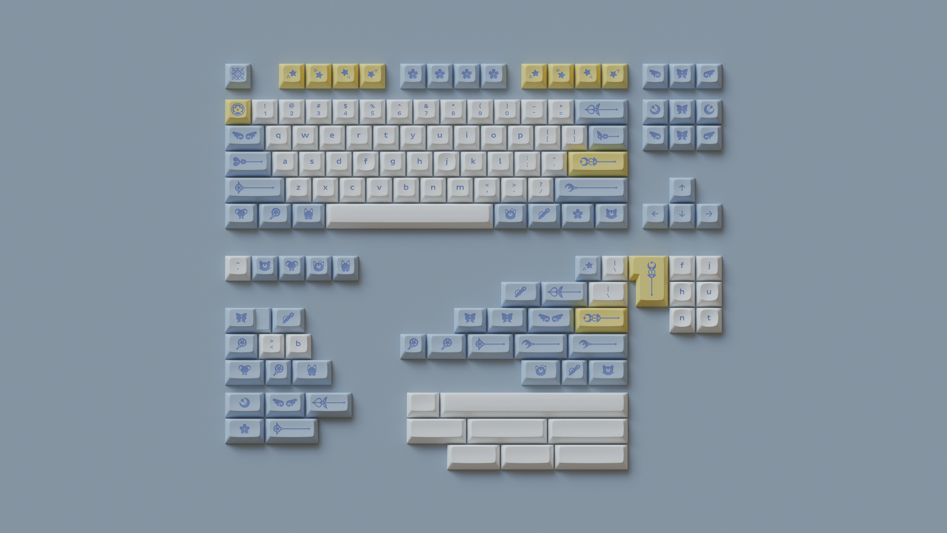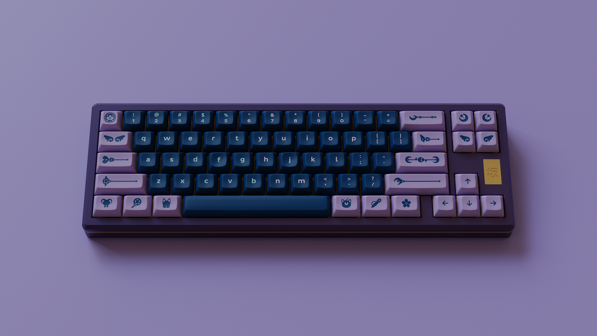 Magic Girl is a keycap set designed as a love letter to the iconic shoujo manga and anime of the 90s by Mintlodica. I created several 3D Visualizations for the set inspired by the soft, pastel colors of the set and of the era which it comes from. In order to display each variant of the set in one shot, I created a scene which accents the soft nature of the iconography and highlights the color identity seen in the set.